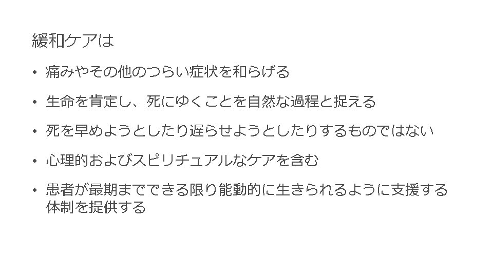 Palliative care • provides relief from pain and other distressing symptoms; • affirms life and regards dying as a normal process; • intends neither to hasten or postpone death; • integrates the psychological and spiritual aspects of patient care; • offers a support system to help patients live as actively as possible until death; http: //www. who. int/cancer/palliative/definition/en/