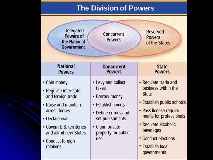 Make a graphic organizer National Government Powers Concurrent Powers State Government Powers