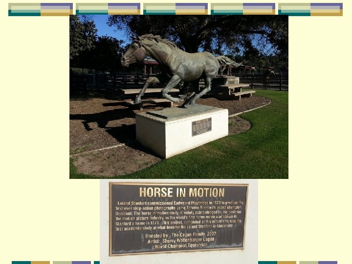 Eadweard Muybridge (1830 -1904) U. S. By 1877, the challenge to prove that at some point in a racehorse's stride, all four hooves are off the ground was met; Muybridge had produced a series of quick-exposure photos that captured all moments in the stride via sequentially-placed cameras, and Stanford had won a $25, 000 bet. Muybridge never produced "moving pictures" himself, nor did he intend to, but his work was worldrenowned an influence on many to follow. Muybridge Stanford