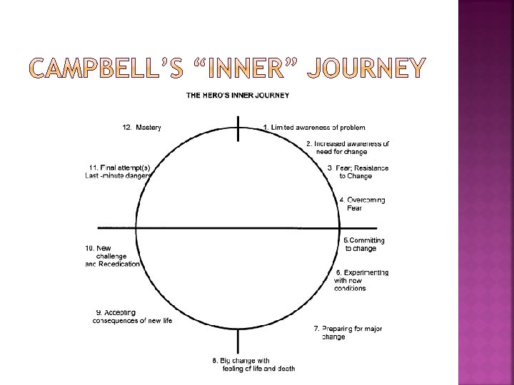 6. TESTS, ALLIES AND ENEMIES. The hero is tested and sorts out allegiances in the Special World. 7. APPROACH. The hero and newfound allies prepare for the major challenge in the Special world. 8. THE ORDEAL. Near the middle of the story, the hero enters a central space in the Special World and confronts death or faces his or her greatest fear. Out of the moment of death comes a new life. 9. THE REWARD. The hero takes possession of the treasure won by facing death. There may be celebration, but there is also danger of losing the treasure again. 10. THE ROAD BACK. About three-fourths of the way through the story, the hero is driven to complete the adventure, leaving the Special World to be sure the treasure is brought home. Often a chase scene signals the urgency and danger of the mission. 11. THE RESURRECTION. At the climax, the hero is severely tested once more on the threshold of home. He or she is purified by a last sacrifice, another moment of death and rebirth, but on a higher and more complete level. By the hero’s action, the polarities that were in conflict at the beginning are finally resolved. 12. RETURN WITH THE ELIXIR. The hero returns home or continues the journey, bearing some element of the treasure that has the power to transform the world as the hero has been transformed.
