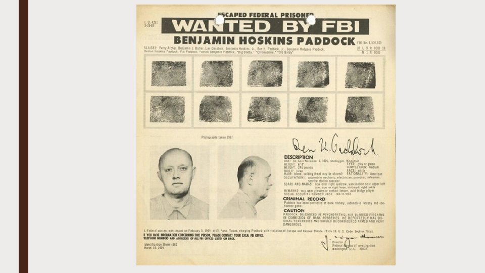 What we do know about Stephen Paddock’s Background ■ Stephen was the oldest of four boys his mother age 90 lives with his brother Eric in Orlando ■ His father Benjamin was a bank robber who was arrested in 1960 when Stephen was seven years old ■ His father Benjamin was later convicted and escaped prison in 1969, subsequently appearing on the FBI's most-wanted list. Stephen was 15 years old at the time. When the father was on the run, the FBI warned that he was both psychotic and suicidal. ■ According to his brother Eric, they never really knew their father as he was never with their mother. One of Stephen’s brother has a a long track record of legal problems ■ Since 2010, he lived with a “kept” and submissive woman in Nevada ■ Spent up to 14 hours a day gambling on - His game of choice was solitary video poker which he had played for over 25 years; unlike traditional poker which involves bluffing, the primary skill is mathematical precision calculating odds. He lived a mostly nocturnal life, gambling after dark and sleeping during the day; he generally disliked being out in the sun. He was not well known among high-stakes gamblers in Las Vegas. He spent over $10, 000 a day gambling