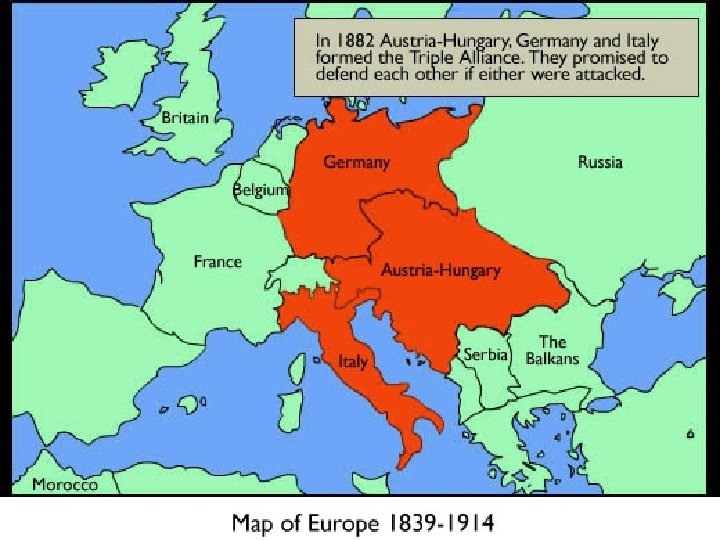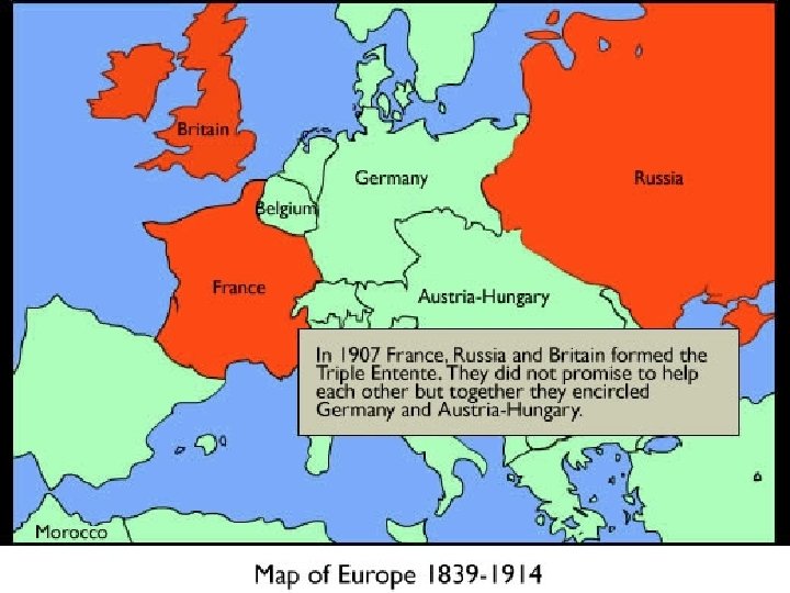 Alliances • Beginning in the 1870 s, European nations formed alliances to protect each other from perceived threats • By 1907, the major powers of Europe were divided into two alliances that were rapidly building up their armies. The Triple Alliance of Germany, Austria. Hungary, and Italy was counter-balanced by The Triple Entente of France, Russia, and Great Britain.