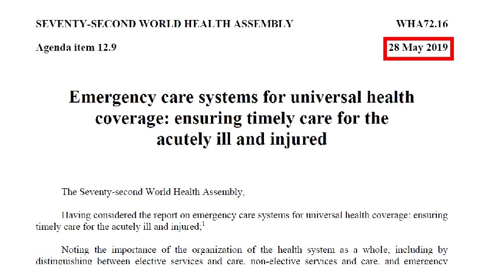 WHO Emergency Care System Framework § Consensus-based essential functions of emergency care systems § Designed for ministries, policy makers, health system administrators, and general advocacy § Facilitates the identification of system gaps to aid in priority setting