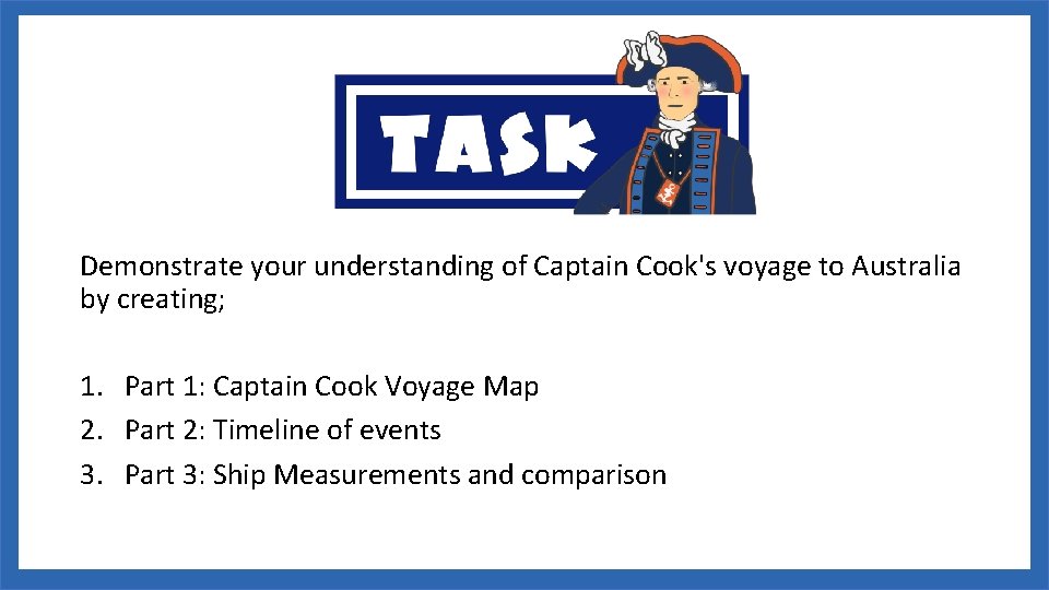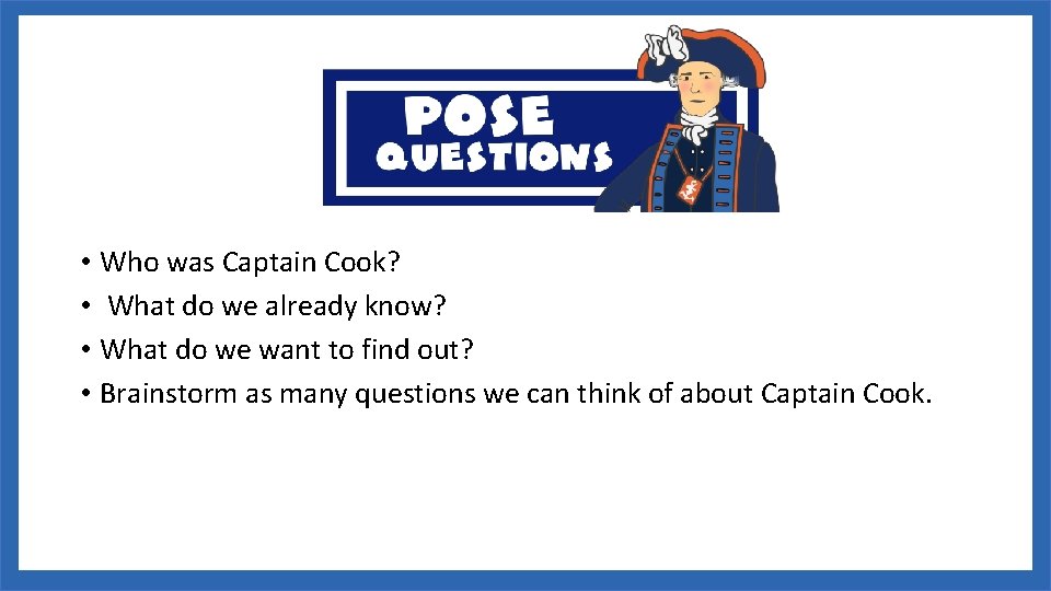 • Who was Captain Cook? • What do we already know? • What do we want to find out? • Brainstorm as many questions we can think of about Captain Cook.