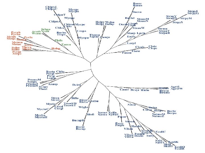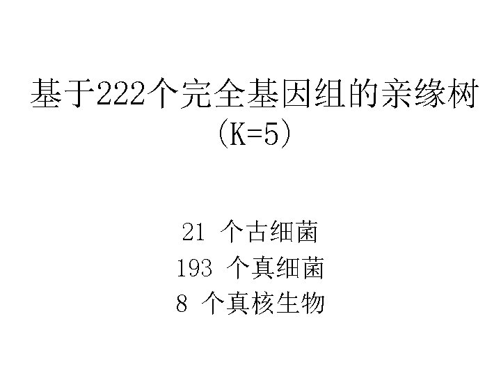 Our Latest Result • • • NCBI Genome data as of 31 December 2004 222 organisms = (21 A + 193 B + 8 E) Input: genome data (the. faa files) Output: a phylogenetic tree No selection of genes, no alignment of sequences, no fine adjustment whatsoever • See the tree first. Story follows.