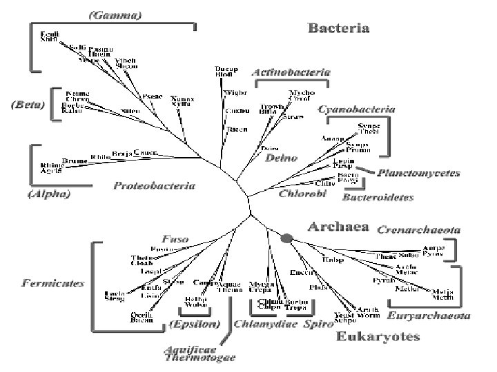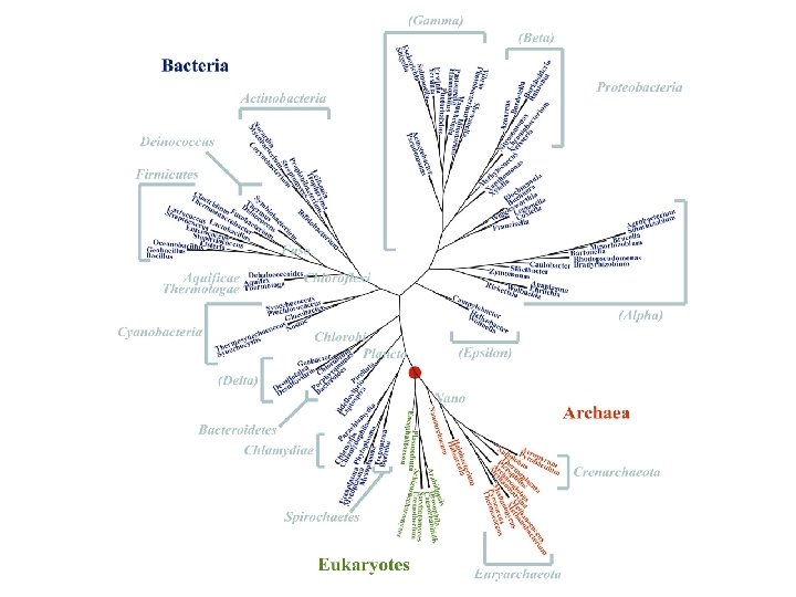 Classification of Prokaryotes: A Long-Standing Problem • Traditional taxonomy: too few features • Morphology:spheric, helices, rod-shaped…… • Metabolism:photosythesis, N-fixing, desulfurization…… • Gram staining:positive and negative • SSU r. RNA Tree (Carl Woese et al. , 1977): – 16 S r. RNA: ancient conserved sequences of about 1500 kb – Discovery of the three domains of life: Archaea, Bacteria and Eucarya – Support to endosymbiont origin of mitochondria and chloroplasts
