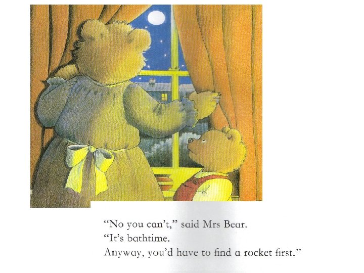 “As a matter of fact, ” said Baby Bear, “I have been up the chimney. I found a rocket and went to visit the moon. ” Mrs Bear laughed. “You and your stories, ” she said. “Whatever next? ”