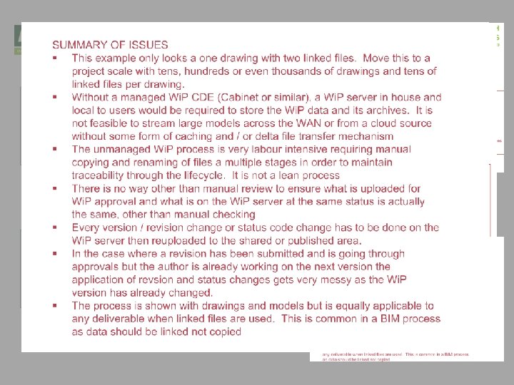 What are the main challenges? • Education and training, “all our users need to be experts in BS 1192”. • Limiting mistakes and rework, as status and revision codes change. • Uploading to various clients’ extranet CDEs whilst maintaining your Shared and Published IP. • Ensuring BS 1192: 2007 compliance and auditable management information. • Implementing the standard across multiple applications (Revit, AECOsim, Auto. CAD, Micro. Station and Office).