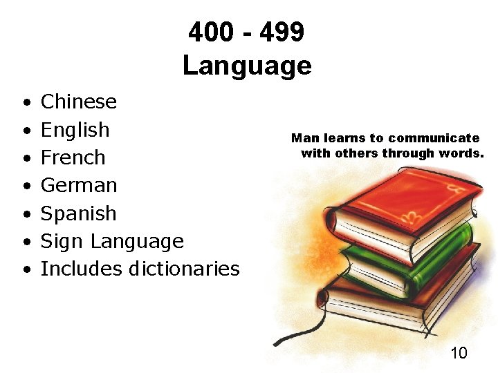400 - 499 Language • • Chinese English French German Spanish Sign Language Includes dictionaries Man learns to communicate with others through words. 10