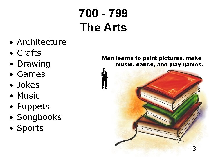 700 - 799 The Arts • • • Architecture Crafts Drawing Games Jokes Music Puppets Songbooks Sports Man learns to paint pictures, make music, dance, and play games. 13