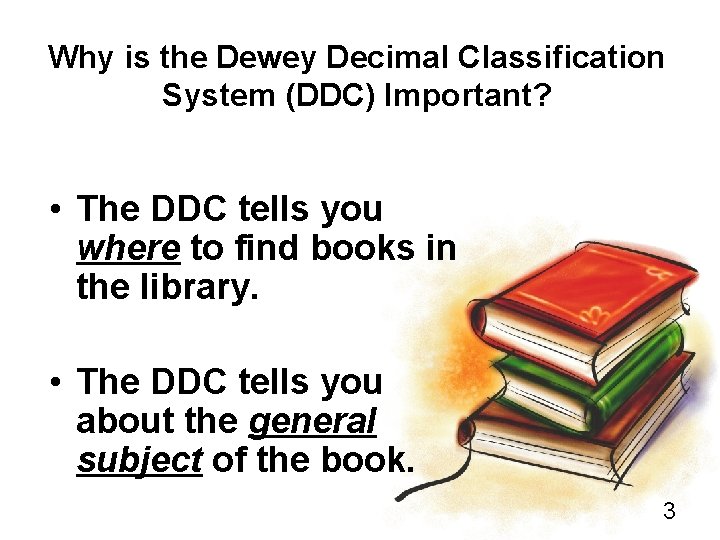 Why is the Dewey Decimal Classification System (DDC) Important? • The DDC tells you where to find books in the library. • The DDC tells you about the general subject of the book. 3