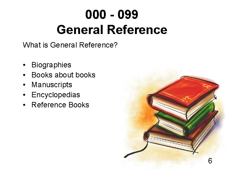 000 - 099 General Reference What is General Reference? • • • Biographies Books about books Manuscripts Encyclopedias Reference Books 6