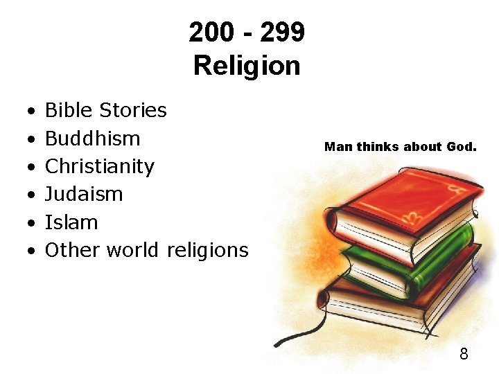 200 - 299 Religion • • • Bible Stories Buddhism Christianity Judaism Islam Other world religions Man thinks about God. 8