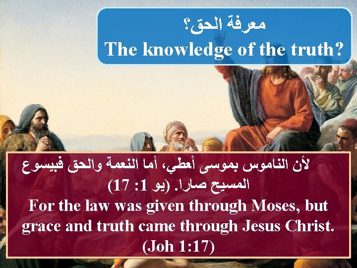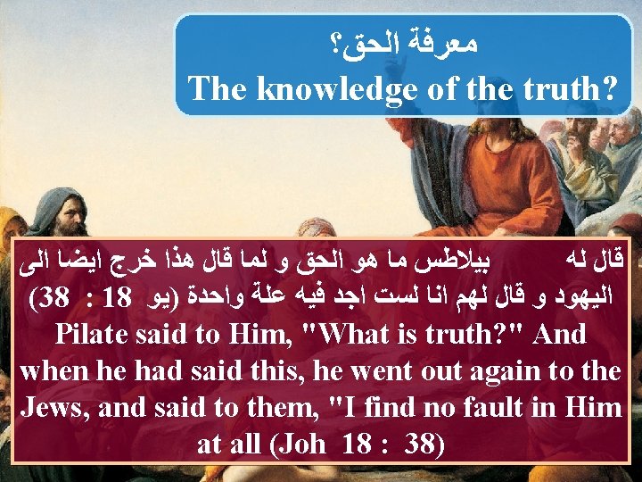 ﻣﻌﺮﻓﺔ ﺍﻟﺤﻖ؟ The knowledge of the truth? ﻷﻦ ﻏﻀﺐ ﺍﻟﻠﻪ ﻣﻌﻠﻦ ﻣﻦ ﺍﻟﺴﻤﺎﺀ ﻋﻠﻰ ﺟﻤﻴﻊ ﻓﺠﻮﺭ ﺍﻟﻨﺎﺱ (18 : 1 )ﺭﻭ. ﺑﺎﻹﺛﻢ ﺍﻟﺬﻳﻦ ﻳﺤﺠﺰﻭﻥ ﺍﻟﺤﻖ ، ﻭﺇﺛﻤﻬﻢ For the wrath of God is revealed from heaven against all ungodliness and unrighteousness of men, who suppress the truth in unrighteousness, (Rom 1 : 18)