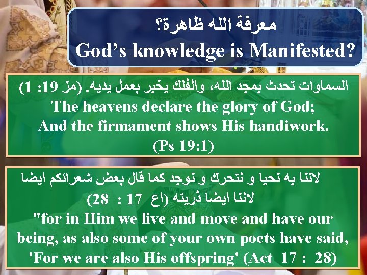 ﻣﻌﺮﻓﺔ ﺍﻟﻠﻪ ﻇﺎﻫﺮﺓ؟ God’s knowledge is Manifested? ﻻﻥ ﺍﻣﻮﺭﻩ . ﻻﻥ ﺍﻟﻠﻪ ﺍﻇﻬﺮﻫﺎ ﻟﻬﻢ ﺍﺫ ﻣﻌﺮﻓﺔ ﺍﻟﻠﻪ ﻇﺎﻫﺮﺓ ﻓﻴﻬﻢ ﻏﻴﺮ ﺍﻟﻤﻨﻈﻮﺭﺓ ﺗﺮﻯ ﻣﻨﺬ ﺧﻠﻖ ﺍﻟﻌﺎﻟﻢ ﻣﺪﺭﻛﺔ ﺑﺎﻟﻤﺼﻨﻮﻋﺎﺕ ﻗﺪﺭﺗﻪ - 19 : 1 )ﺭﻭ. ﺑﻼ ﻋﺬﺭ ﻻﻫﻮﺗﻪ ﺣﺘﻰ ﺍﻧﻬﻢ ﺍﻟﺴﺮﻣﺪﻳﺔ ﻭ (20 because what may be known of God is manifest in them, for God has shown [it] to them. For since the creation of the world His invisible [attributes] are clearly seen, being understood by the things that are made, [even] His eternal power and Godhead, so that they are without excuse, . (Rom 1 : 19 - 20)