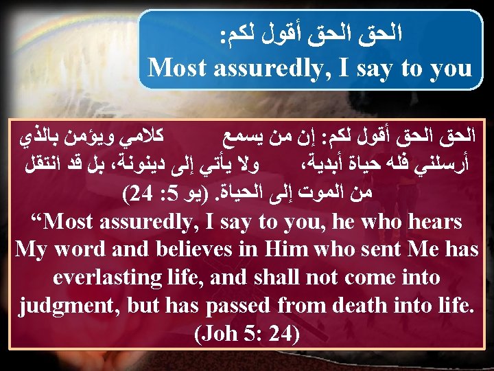 : ﻣﺤﺒﺔ ﺍﻟﺤﻖ The Love of the Truth: ﺣﺘﻰ ، ﺍﻟﻀﻼﻝ ﻭﻻﺟﻞ ﻫﺬﺍ ﺳﻴﺮﺳﻞ ﺍﻟﻴﻬﻢ ﺍﻟﻠﻪ ﻋﻤﻞ ﺑﻞ ﺳﺮﻭﺍ ، ﻟﻜﻲ ﻳﺪﺍﻥ ﺟﻤﻴﻊ ﺍﻟﺬﻳﻦ ﻟﻢ ﻳﺼﺪﻗﻮﺍ ﺍﻟﺤﻖ ، ﻳﺼﺪﻗﻮﺍ ﺍﻟﻜﺬﺏ . ﺑﺎﻻﺛﻢ (12 -9 : 2 ﺗﺲ 2) And for this reason God will send them strong delusion, that they should believe the lie, that they all may be condemned who did not believe the truth but had pleasure in unrighteousness. (2 Ts 2: 9 -12)