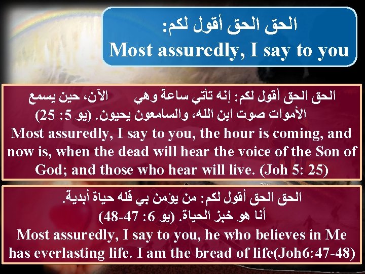 : ﻣﺤﺒﺔ ﺍﻟﺤﻖ The Love of the Truth: ، ﻭﺑﺎﻳﺎﺕ ﻭﻋﺠﺎﺋﺐ ﻛﺎﺫﺑﺔ ، ﺑﻜﻞ ﻗﻮﺓ ، ﺍﻟﺬﻱ ﻣﺠﻴﺌﻪ ﺑﻌﻤﻞ ﺍﻟﺸﻴﻄﺎﻥ ﻻﻧﻬﻢ ﻟﻢ ﻳﻘﺒﻠﻮﺍ ﻣﺤﺒﺔ ، ﻓﻲ ﺍﻟﻬﺎﻟﻜﻴﻦ ، ﺍﻻﺛﻢ ﻭﺑﻜﻞ ﺧﺪﻳﻌﺔ . ﺍﻟﺤﻖ ﺣﺘﻰ ﻳﺨﻠﺼﻮﺍ The coming of the lawless one is according to the working of Satan, with all power, signs, and lying wonders, and with all unrighteous deception among those who perish, because they did not receive the love of the truth, that they might be saved.