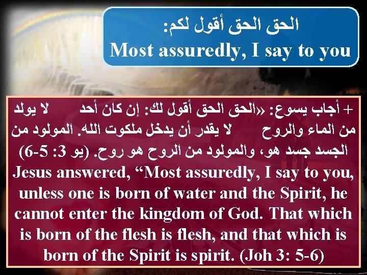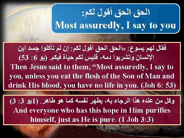 : ﻋﻤﻮﺩ ﺍﻟﺤﻖ ﻗﺎﻋﺪﺗﻪ The pillar and ground of the truth: ﺗﺒﺮﺭ ، ﺍﻟﻠﻪ ﻇﻬﺮ ﻓﻲ ﺍﻟﺠﺴﺪ : ﻭﺑﺎﻻﺟﻤﺎﻉ ﻋﻈﻴﻢ ﻫﻮ ﺳﺮ ﺍﻟﺘﻘﻮﻯ ﺍﻭﻣﻦ ، ﺍﻻﻣﻢ ﻛﺮﺯ ﺑﻪ ﺑﻴﻦ ، ﻟﻤﻼﺋﻜﺔ ﺗﺮﺍﺀﻯ ، ﻓﻲ ﺍﻟﺮﻭﺡ (16 -15 : 3 ﺗﻲ 1). ﺭﻓﻊ ﻓﻲ ﺍﻟﻤﺠﺪ ، ﺑﻪ ﻓﻲ ﺍﻟﻌﺎﻟﻢ And without controversy great is the mystery of godliness: God was manifested in the flesh, Justified in the Spirit, Seen by angels, Preached among the Gentiles, Believed on in the world, Received up in glory. (1 Ti 3: 15 -16)