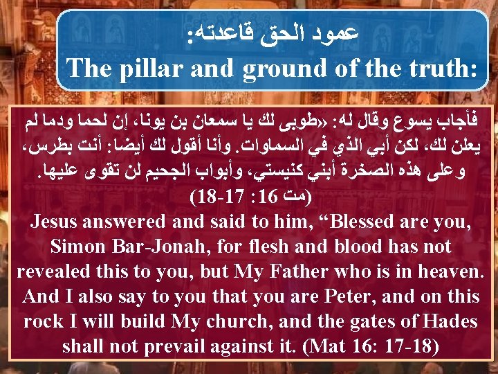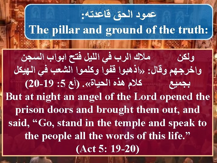 : ﻋﻤﻮﺩ ﺍﻟﺤﻖ ﻗﺎﻋﺪﺗﻪ The pillar and ground of the truth: ﻓﻠﻜﻲ ﺗﻌﻠﻢ ﻛﻴﻒ ﻳﺠﺐ ﺍﻥ ﺗﺘﺼﺮﻑ ﻓﻲ ﺑﻴﺖ ، ﻭﻟﻜﻦ ﺍﻥ ﻛﻨﺖ ﺍﺑﻄﺊ . ﻋﻤﻮﺩ ﺍﻟﺤﻖ ﻭﻗﺎﻋﺪﺗﻪ ، ﺍﻟﺬﻱ ﻫﻮ ﻛﻨﻴﺴﺔ ﺍﻟﻠﻪ ﺍﻟﺤﻲ ، ﺍﻟﻠﻪ but if I am delayed, I write so that you may know how you ought to conduct yourself in the house of God, which is the church of the living God, the pillar and ground of the truth.