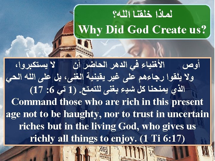 ﻟﻤﺎﺫﺍ ﺧﻠﻘﻨﺎ ﺍﻟﻠﻪ؟ Why Did God Create us? . ﺑﻜﻞ ﻣﻦ ﺩﻋﻲ ﺑﺎﺳﻤﻲ ﻭﻟﻤﺠﺪﻱ ﺧﻠﻘﺘﻪ ﻭﺟﺒﻠﺘﻪ ﻭﺻﻨﻌﺘﻪ (7 : 43 )ﺇﺵ Everyone who is called by My name, Whom I have created for My glory; I have formed him, yes, I have made him. ” (Is 43: 7)