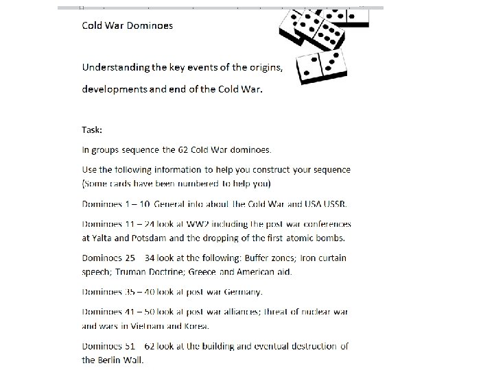 The start of the Cold war TASK: Comprehension • Read pages 110 -114. • Look at the bullet points on the right. • Write BRIEF notes (2 -3 sentences ) on each one. • You have 15 mins so work fast. 1. Spheres of influence. 2. Stalinisation of Eastern Europe. 3. Start of the Cold War. 4. Economic superpower 5. Fourth Five Year Plan 6. Economic Boom 7. Military Superpower.