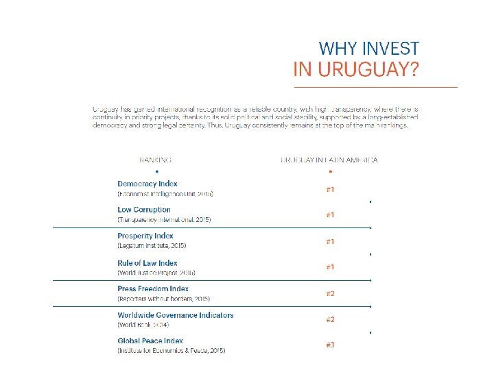 Why invest in Agribusiness in Uruguay? • Uruguay grew at an average annual rate of 5. 4% between 2004 and 2014, which made it one of the fastest growing countries in the region. • Foreign investment has reached record levels, and this allowed Uruguay to position itself as the second largest recipient of FDI in South America (5. 6% of GDP) in the last decade. • Global demand for agricultural commodities will remain firm in the coming decades, mainly sustained by Asia’s higher consumption of proteins, fats and sugars. • Uruguay is part of the main food exporting region in the world (together with Argentina, Brazil and Paraguay). • Uruguay has a comparative advantage in food production worldwide. The agribusiness sector accounts for 75% of all goods exported by Uruguay in 2014. • Uruguay has 16. 4 million hectares suitable for agricultural use, about 93% of the total land area of the country. • Land itself has appreciated substantially in Uruguay in recent years, from USD 385 per hectare (ha) in 2002 to USD 3, 934 per ha in 2014.