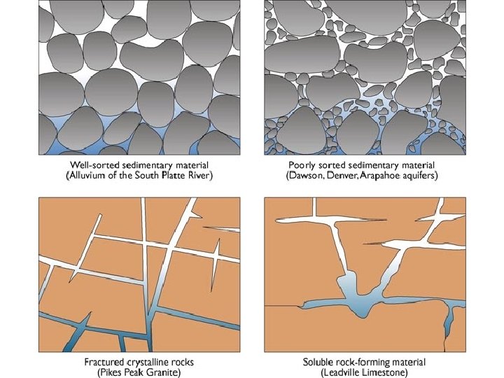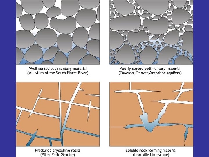 Porosity % of the total volume of the rock that contains pore spaces Permeability the ability of a material to transmit fluid Aquifer Permeable rock strata or sediments that transport groundwater