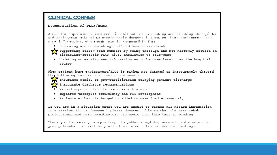It Starts with the Evaluation! Identifying barriers ◦ PLOF ◦ What was it? ◦ How close is the patient to their baseline? ◦ When was it? ◦ Home environment ◦ Barriers/facilitators ◦ Modification possible? ◦ Social Support ◦ Ability and availability