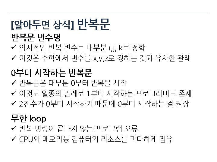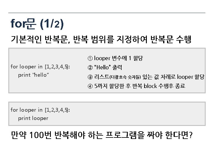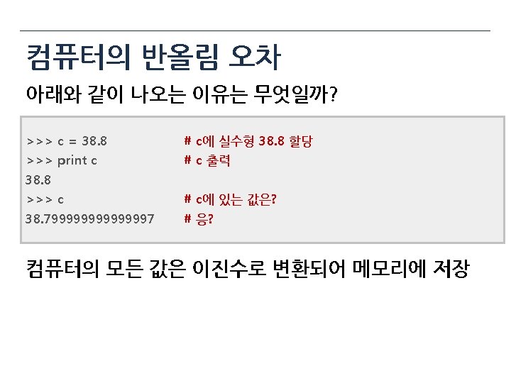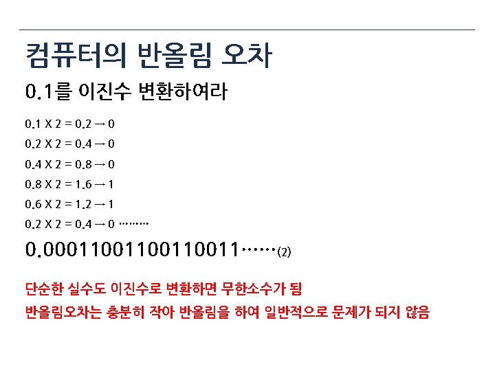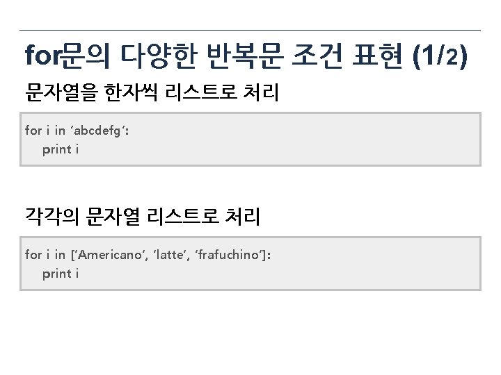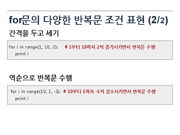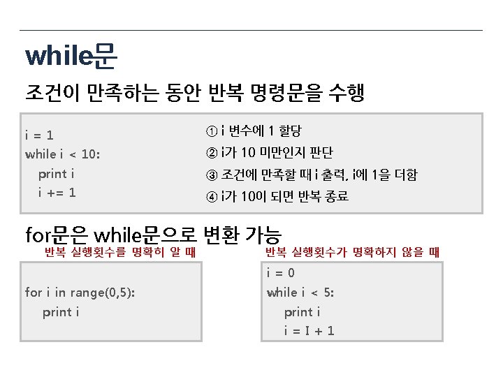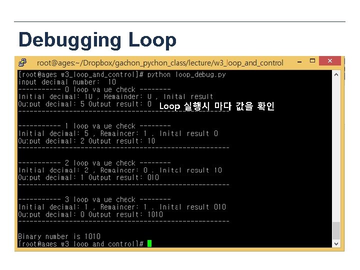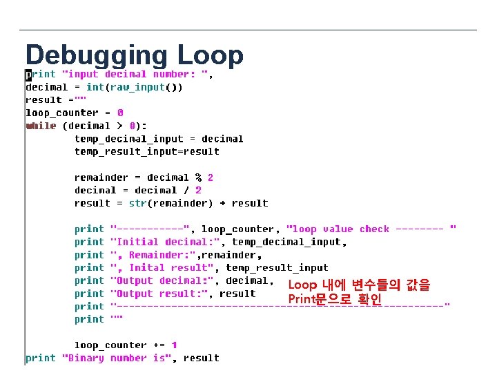 수식 decimal = 10 result = ‘’ while (decimal > 0): remainder = decimal % 2 decimal = decimal / 2 result = str(remainder) + result print result 2 10 … 0 2 5 … 1 2 2 … 0 2 1 Loop 0 decimal 1 10 remainder 0 decimal 2 5 result 1 result 2 0 1 5 1 2 0 10 2 2 0 1 10 010 3 1 1 0 010 1010