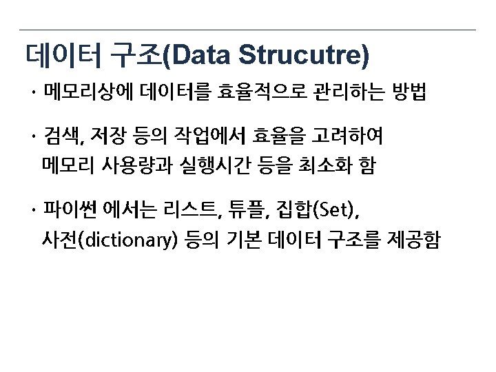 리스트 (lists) ㆍ문자형과 같은 시퀀스 자료형, 여러 데이터들의 집합 colors = ['red', 'blue', 'green'] print colors[0] ## red print colors[2] ## green print len(colors) ## 3 Source: http: //goo. gl/q 4 Vv. B 1, http: //goo. gl/JMb. Hm 0