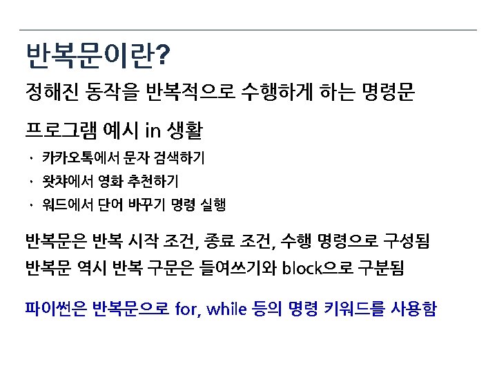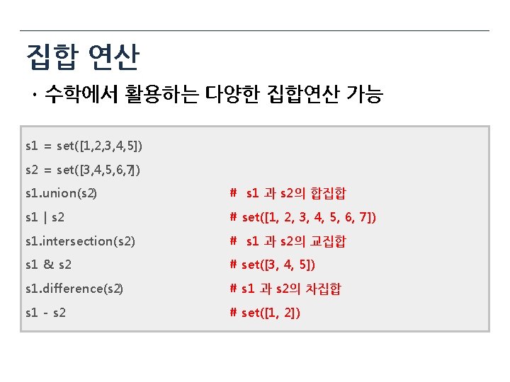 리스트의 연산 ㆍ인덱싱, 슬라이싱, 연산등을 동일하게 사용 color = ['red', 'blue', 'green'] color 2 = ['orange', 'black', 'white'] print color + color 2 # 두 리스트 합치기 len(color) # 리스트 길이 color[0] = ‘yellow’ # 0번째 리스트의 값을 변경 print color * 2 # color 리스트 2회 반복 ‘blue’ in color 2 # 문자열 ‘blue‘가 color 2 존재 여부 반환 total_color = color + color 2 for each_color in total_color # total_color에 입력된 문자열 하나씩 순회 print each_color