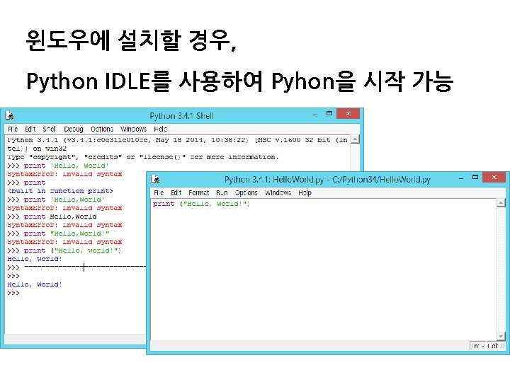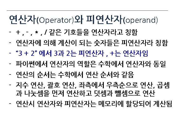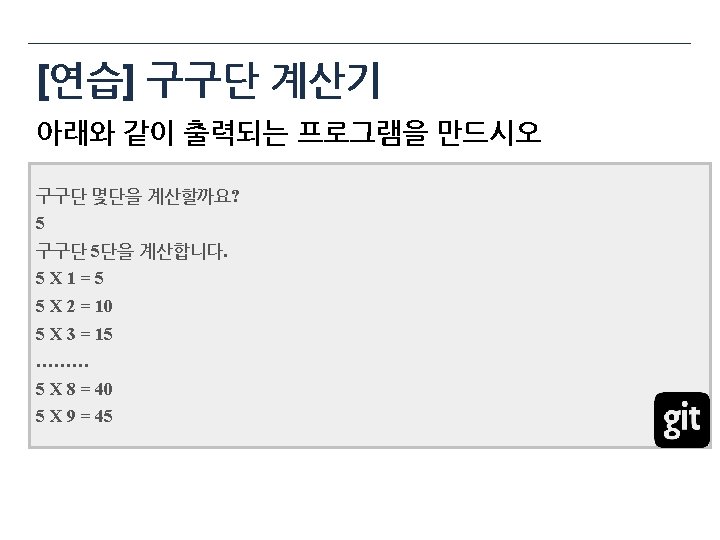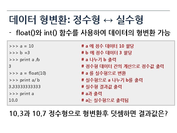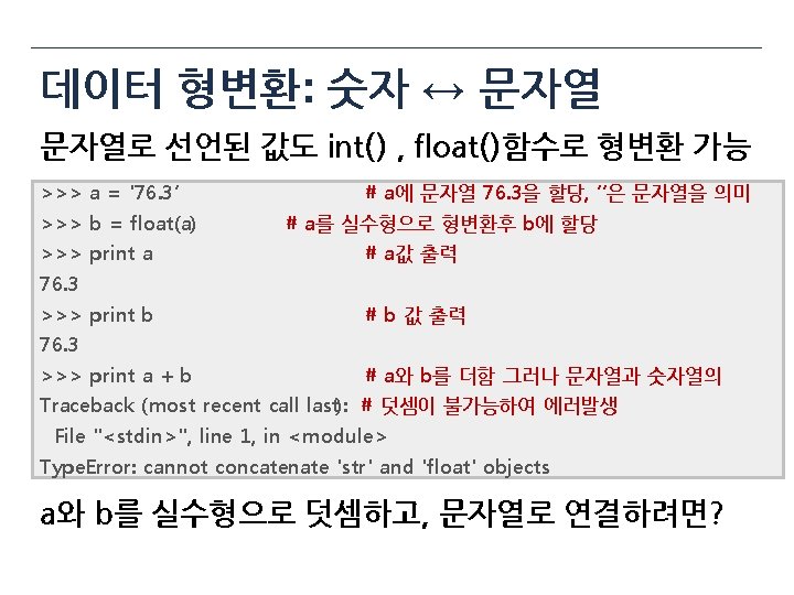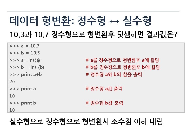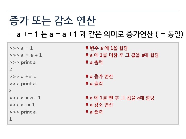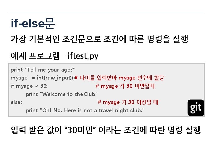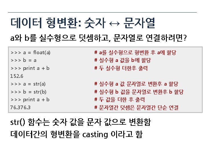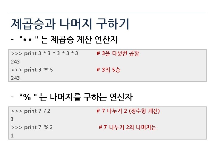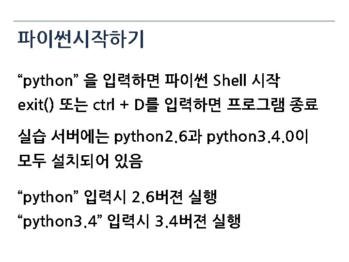 콘솔창 입출력 raw_input() 함수는 콘솔창에서 문자열을 입력받음 raw_input. py print "Enter your name: " somebody = raw_input() # 콘솔창에서 입력한 값을 somebody에 저장 print "Hi", somebody, "How are you today? " 실행 $ python raw_input. py # 코드 실행 Enter your name: Sungchul Choi # 콘솔창에서 이름 입력 Hi Sungchul Choi How are you today?