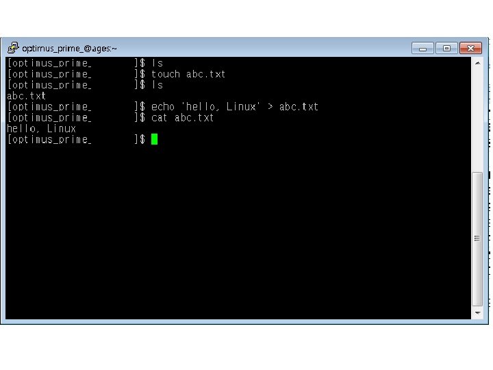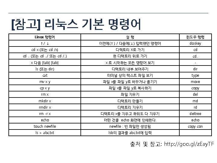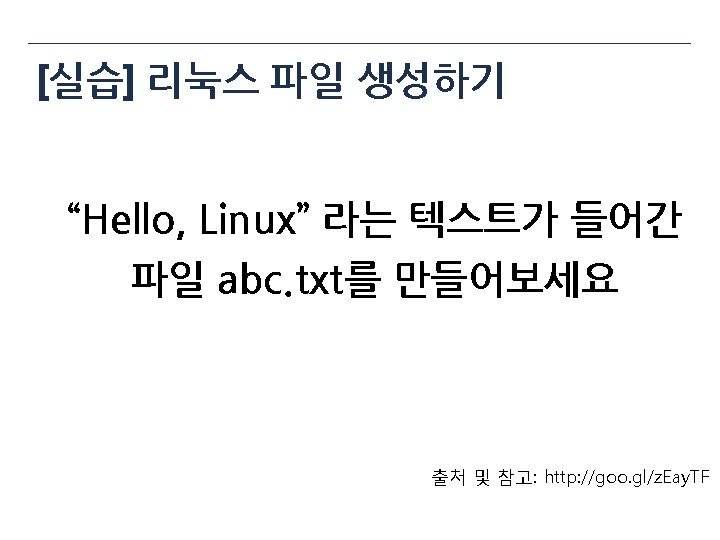 [실습] 리눅스 파일 생성하기 1. touch abc. txt 2. ls 명령으로 생성확인 3. echo ‘Hello, Linux’ > abc. txt 4. cat abc. txt 출처 및 참고: http: //goo. gl/z. Eay. TF
