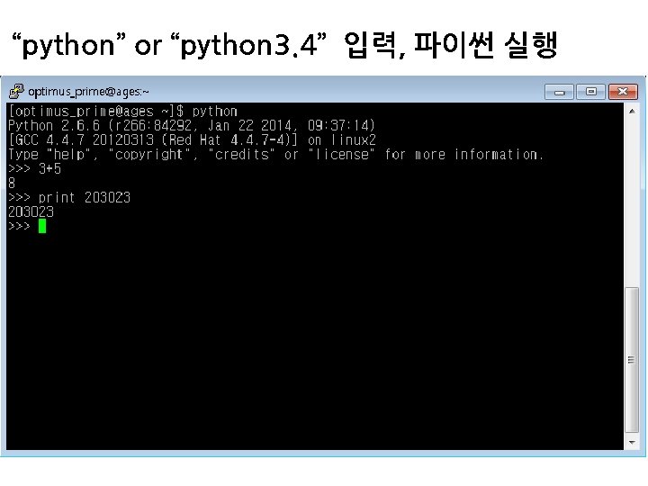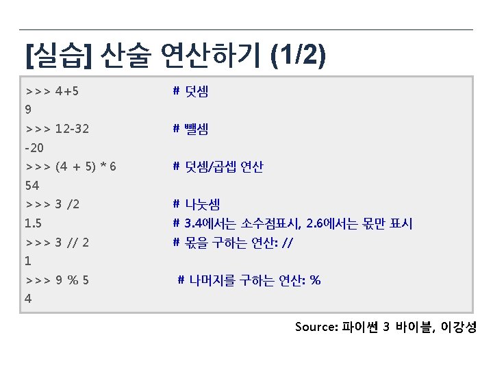 [실습] 파이썬 프로그램 만들기 아래의 프로그램을 “myfirstpython. py” 파일로 작성후 실행하세요. print "I Love pizza!" print "pizza" * 5 print "yum" * 3 print "I'm full. " [~@server ~]$ python myfirstpython. py I Love pizza! pizzapizzapizza yumyumyum I'm full. Source: 파이썬 3 바이블, 이강성