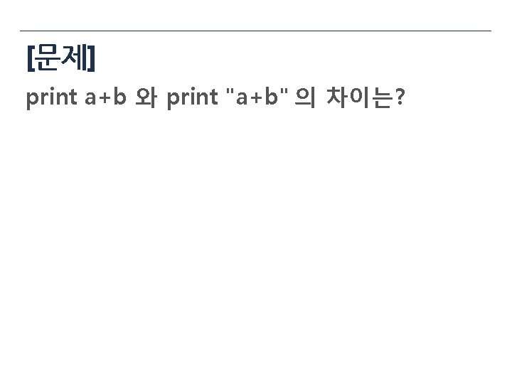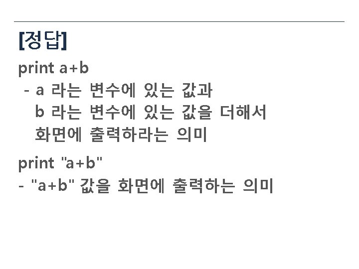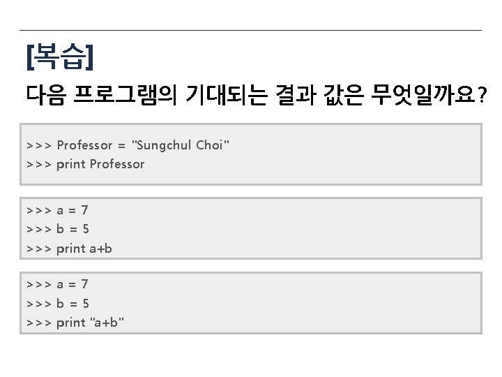 [정답] >>> Professor = "Sungchul Choi" >>> print (Professor) Sungchul Choi >>> a = 7 >>> b = 5 >>> print (a+b) 12 >>> a = 7 >>> b = 5 >>> print ("a+b") a+b