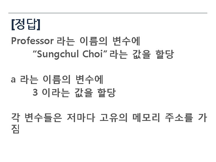 [문제] Professor = “Sungchul Choi” 의 의미는” ① Professor의 이름은 Sungchul Choi 이다. ② Professor는 Sungchul Choi 이다. ③ Professor와 Sungchul Choi는 같다. ④ Professor에 Sungchul Choi를 넣어라