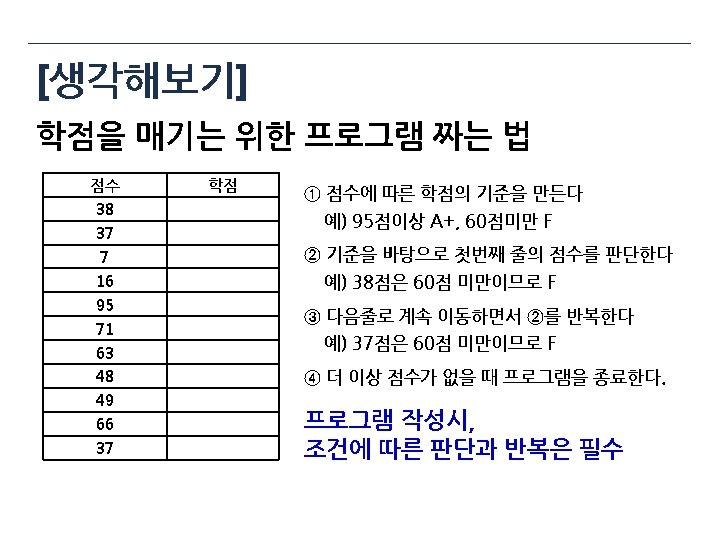 조건 판단 연습 (1/ 3) 다음 프로그램 수행 결과는? if score >= 90: grade = 'A' if score >= 80: grade = 'B' if score >= 70: grade = 'C' if score >= 60: grade = 'D' if score < 60: grade = 'F' print grade score 38 37 7 16 95 71 63 48 49 66 37 grade