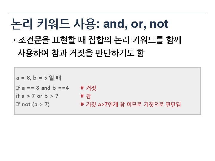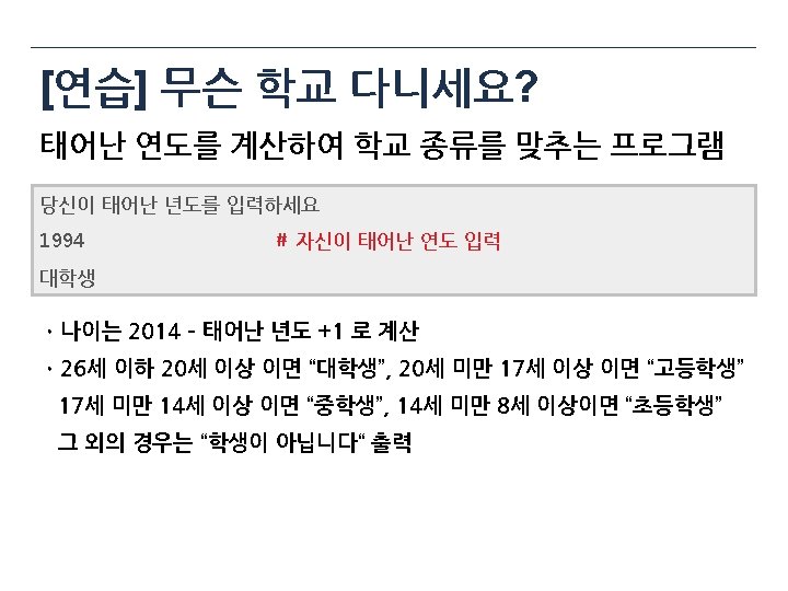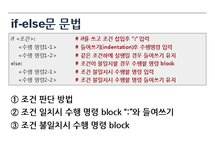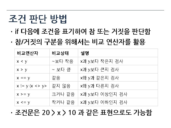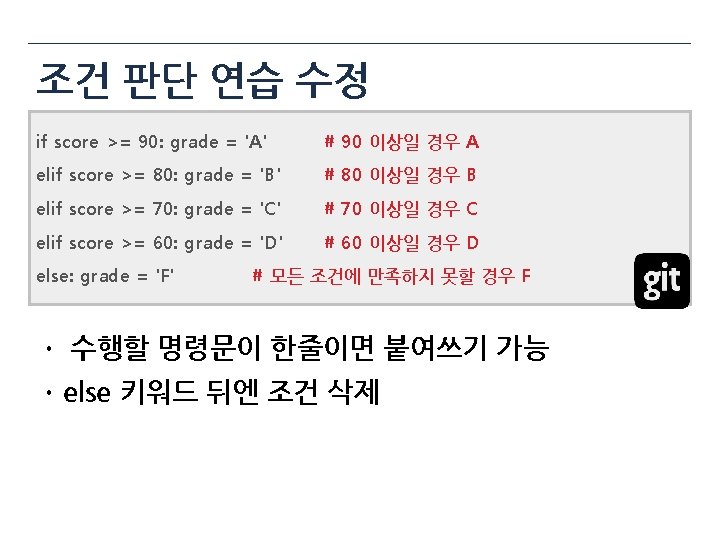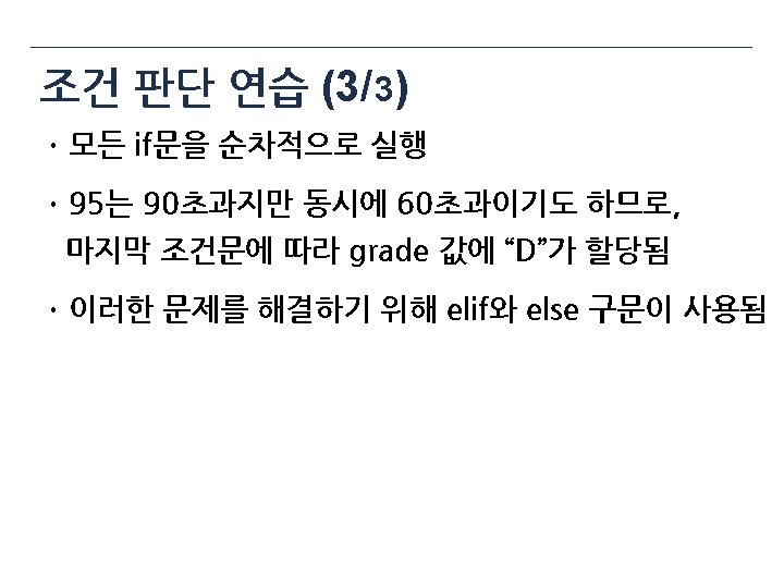 조건 판단 연습 (2/ 3) if score >= 90: grade = 'A' if score >= 80: grade = 'B' if score >= 70: grade = 'C' if score >= 60: grade = 'D' if score < 60: grade = 'F' print grade score grade 38 F 37 F 16 F 95 D 71 D 63 D 48 F 49 F 66 D 37 F