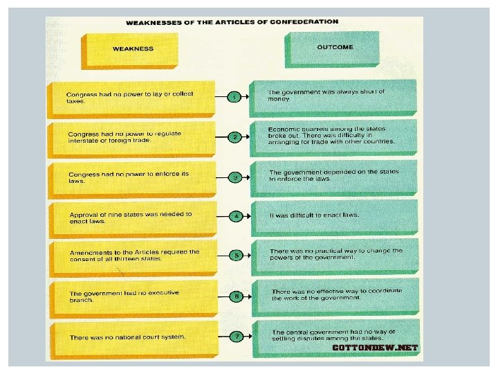 WEAKNESSES OF ARTICLES § Lack of ability to raise money Congress had no power to collect taxes. § no power to regulate trade § no power to enforce its laws Lack of Central Power § No single leader or group directed government policy. § No national court system existed. Rules Too Rigid § Congress could not pass laws without the approval of 9 states. § The Articles could not be changed without the agreement of all 13 states.