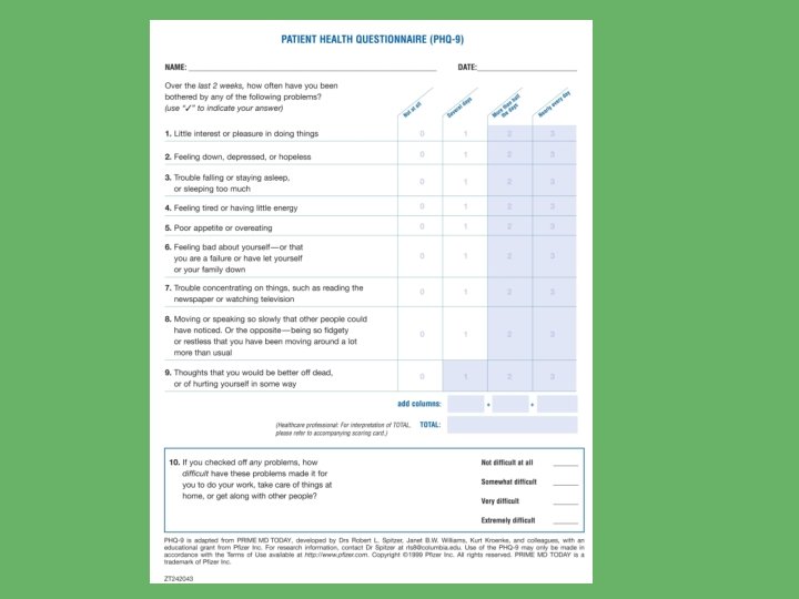 PHQ-2 Over the past two weeks, how often have you been bothered by any of the following problems? Little interest or pleasure in doing things: 0 –Not at all 1—Several days 2—More than half the days 3—Nearly every day Having little interest or pleasure in doing things: 0 –Not at all 1—Several days 2—More than half the days 3—Nearly every day
