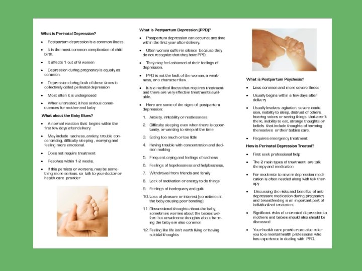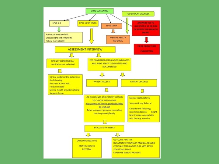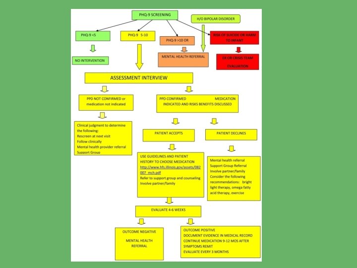 Perinatal Depression Screening • Antenatal early risk assessment and screening during pregnancy. ACOG recommends the PHQ-2 once per trimester • If at high risk (prior history, neonatal loss, obstetrical complications, etc): Upon discharge from hospital. Need to assess support plan post discharge Visiting nurse follow-up visit a good time • At postpartum visit with OB/Midwife At early (2 week) follow up appointment if high risk At routine 6 -7 week visit • Well-child visit is an ideal time to look for signs of PPD in the mother (See pediatric provider frequently first year) The American Academy of Pediatrics recommends "routine, brief, maternal depression screening conducted during well-child visits” • Other possibilities are visiting nurse visits, lactation consultants