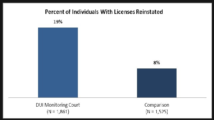Minnesota Study in 9 DWI Courts Completed September 2014 Participants (regardless of graduation status), at the majority of the 9 DWI courts had lower re-arrest rates but not all of them Graduates 0. 870000003 0. 57 0. 59 0. 70 0. 650000003 0. 54 0. 520. 53 0. 46 0. 3100000020. 29 All Participants 0. 36 0. 20 0. 14 0. 30 Comparison 0. 81 0. 750000000000003 0. 620000003 0. 47 0. 34 0. 21 0. 30 0. 19 0. 44 0. 28 0. 25 DWI Court DWI Court DWI Court #1 #2 #3 #4 #5 #6 #7 #8 #9 n = 51 n = 48 n = 46 n = 273 n = 33 n = 43 n = 140 n = 30 n = 74