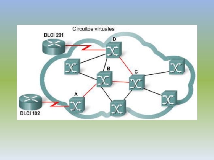 Frame Relay Muy Popular, Precio Bajo en comparación con una línea privada, Su predecesor es X. 25 Redes de Acceso Múltiple sin Broadcast (NBMA, Non-Broadcast Multiple Access). No tiene la noción de broadcast, capa 2 dirección mac-address, puros 1´s en la dirección destino, utiliza DLCI en vez de mac-address Acces Rate: Ancho de Banda donde recide frame relay, velocidad en la interface, E 1, T 1, etc. Velocidad de información suscrita (CIR): A que velocidad que se enviaran los datos Virtual Circuits: No siempre los paquetes siguen el mismo camino, PVC, Circuito virtual Permanente (SVC, Switched Virtual Circuit) identificadores de control de enlace de datos (DLCI, Data Link Control Identifiers) Dirección de capa 2, es un valor en decimal desde el 16 hasta el 1007, tiene significado local, solamente lo conoce el router conectada directamente a la nube de Frame Relay, los proporciona el ISP Interfaz de administración local (LMI) Local Management Interface: Es un estándar de señalización entre el router y el switch de Frame Relay, es donde pasan los keepalives, maneja multicasting Congestion Control: DE (elegible para descarte, Discard Eligible) cuando se manda un paquete al access rate, solamente pasara un paquete si no hay congestión en la red FECN (congestión-notificación son la Notificación explícita de congestión hacia adelante, Forward Explicit Congestion Notification) y la notificación explícita de congestión hacia atrás (BECN, Backward Explicit Congestion Notification) para los dos, cuando los switches de Frame Relay saben que hay congestion en la red
