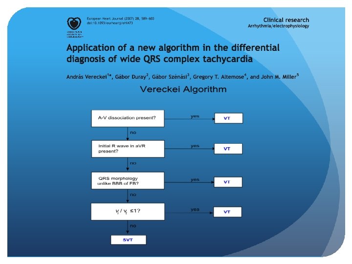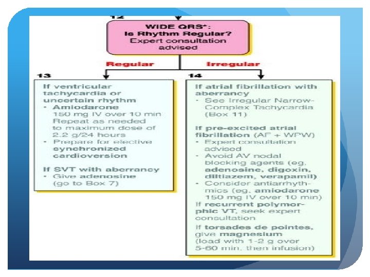 Approach to WCT 1. History 2. Physical Exam 3. ECG Regular: VT, SVT with aberrancy, SVT with accessory pathway, Electrolyte abnormalities, Medications Irregular: a fib + pre-excitation, a fib + BBB, a flutter + BBB, MAT + BBB, polymorphic Vtach (torsades) ? AV dissociation, Fusion beats, capture beats 4. Adenosine (? Diagnostic, ? therapeutic)