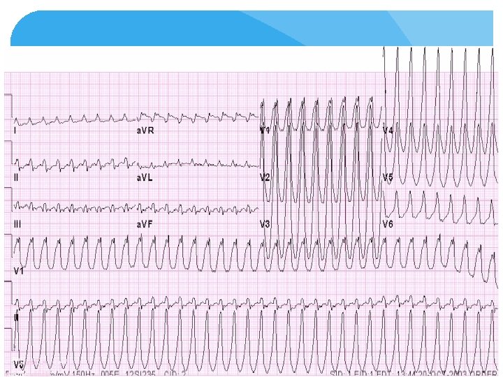 DDx: Ventricular tachycardia SVT with a preexisting bundle branch block or a functional rate related bundle branch block SVT with antegrade conduction via an accessory pathway Drug induced – TCA, Class one antiarryhtmic Electrolyte - hyperkalemia