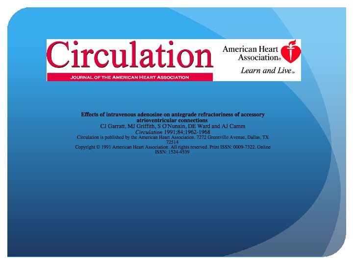 Adenosine in the Diagnosis of Broad Complex Tachycardia - Griffith et al. The Lancet March 1988 89% Sensitivity, 95% specificity, 92% predictive accuracy for SVT origin Broad Complex Tachycardia SVT VT 8/9 1/17 Atrial Fibrillation with WPW 0/6 No change in mean RR