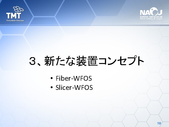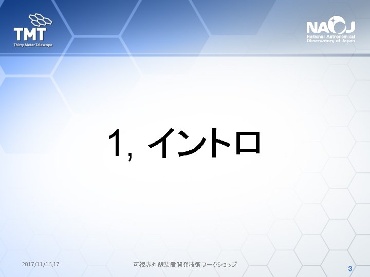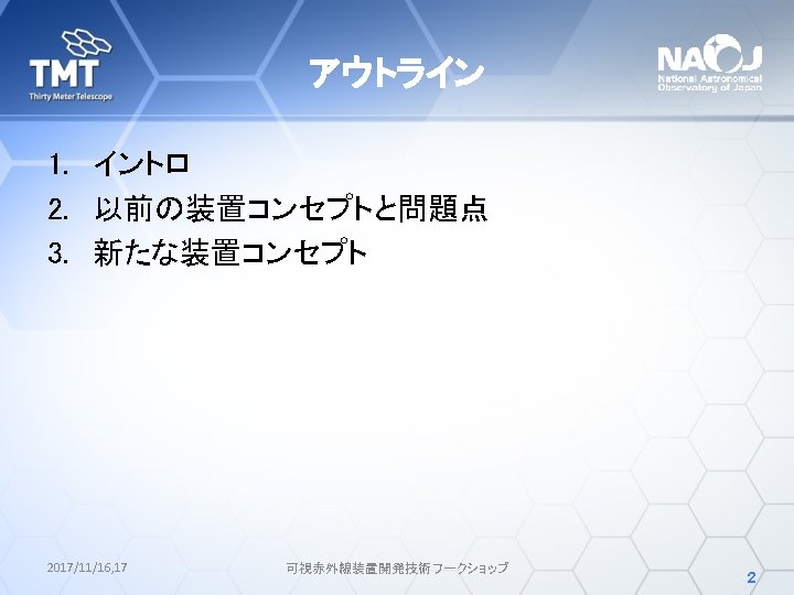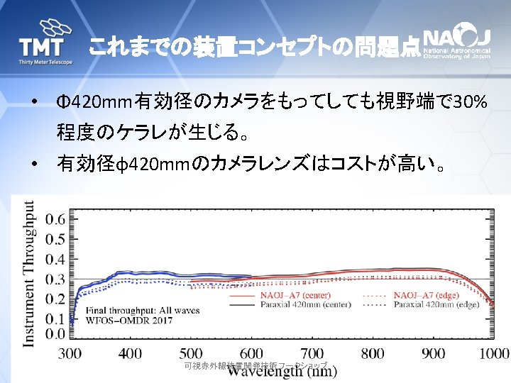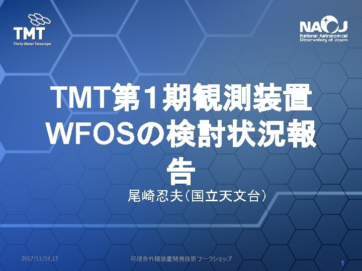 Wide Field Optical Spectrograph (WFOS) • TMT第一期観測装置の一つ • 国際共同開発 UCSC (US), Caltech(US), NIAOT (China), IIA (India), NAOJ (Japan) NIAOT: Nanjing Institute of Astronomical Optics and Technology IIA: Indian Institute of Astrophysics • 今後、その他の機関も参加予定 2017/11/16, 17 可視赤外線装置開発技術ワークショップ 4