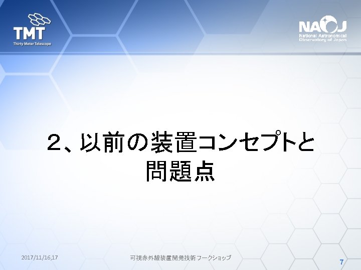Parameters Field of View 8. 3× 3 arcmin 2 Wavelength coverage 310 – 1, 000 nm Imaging Observation mode Long slit spectroscopy Multi slit spectroscopy Spectral resolution 2017/11/16, 17 R~1000, 5000 for 0. 75” slit width 可視赤外線装置開発技術ワークショップ 6