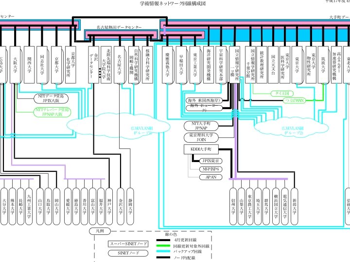 JGNII L 2 Configuration 産学IT金沢 A P FE× 6 産学IT 北九州 10 GE(W) GS 80 E GE× 2 (SX) GS 160 E GE× 2 (SX) GE(SX) 10 G OTN X 320 A P GE(SX) 9812 広島 10 GE(L) GS 320 E GE× 1(SX) GE(SX) GS 160 E 岡山 X 320 A P FE× 4 A P GE(SX) 9812 GE× 2 (SX) GS 80 E 四国 9812 GE× 2 (SX) M 5 京大 阪大 実験設備 CRL小金井 実験設備 名古屋 10 GE(L) NI 40 G GE(SX) G 20 CRL鹿島 (対外接続用) GS 320 E GS 80 E M 160 T 320 10 GE(L) 10 GE(L) GS 80 E 東大 10 GE(L) Catalyst 岡山 GS 160 E FE× 3 GS 80 E GE× 1(SX) 10 G (SONET/SDH) 10 G IX (SONET/SDH) 10 G OTN 10 GE(L) 10 G (SONET/SDH) 大手 10 G (SONET/SDH) CRLけいはんな G 20 GE× 8(SX) 10 G(SONET/SDH) 大手 10 G (SONET/SDH) 10 G GE× 2(LX) (SONET/SDH) 大阪 GE× 2(SX) IP 8800 東北大 つくば 10 G GS (SONET/SDH) つくばWAN 80 E GE× 2(LX) 金沢 GE(SX) M 5 AFE× 4 P 10 GE(W) GE× 2(LX) 10 G(SONET/SDH) 天神 10 GE(L) GSR FE× 1 札幌 or. Gb. E 9812 GE× 2(SX)GE(SX) 9812 GE× 4 (SX) GSR GE× 2(LX) 九大 GS 80 E 仙台 GS 80 E GE(SX) GS 160 E GE× 2 (SX) GS 80 E GSR A P GE(SX) A P GE× 1(SX) GE(SX) FE× 5 9812 FE× 2 10 GE(W) CRL沖縄 9812 A P GE× 4 (SX) GR 2000 FE× 2 長野 GR 2000 IP 8800 FE× 4 A P GE(SX) GS 160 E YRP(CRL) 9812 OXC GMPLSルータ L 2 SW 10 GE(W): 10 Gb. E W 10 GE(L): 10 Gb. E L