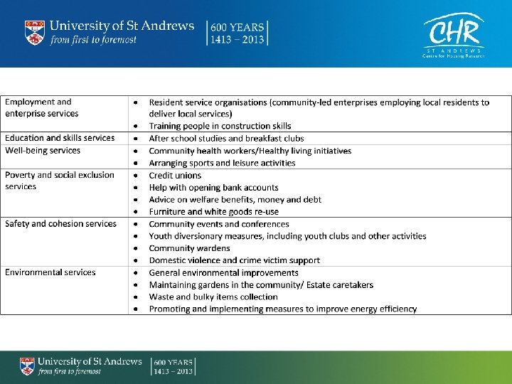 Definitions • ‘Wider Outcomes’: ‘Plain vanilla’ housing contributions to ‘other than housing’ social goals (economic, education, health/care, sustainability) • ‘Wider Roles’: Broader service packages (encompassing employment, skills, education, well-being, inclusion and environmental purposes) for the purpose of helping to anchor communities